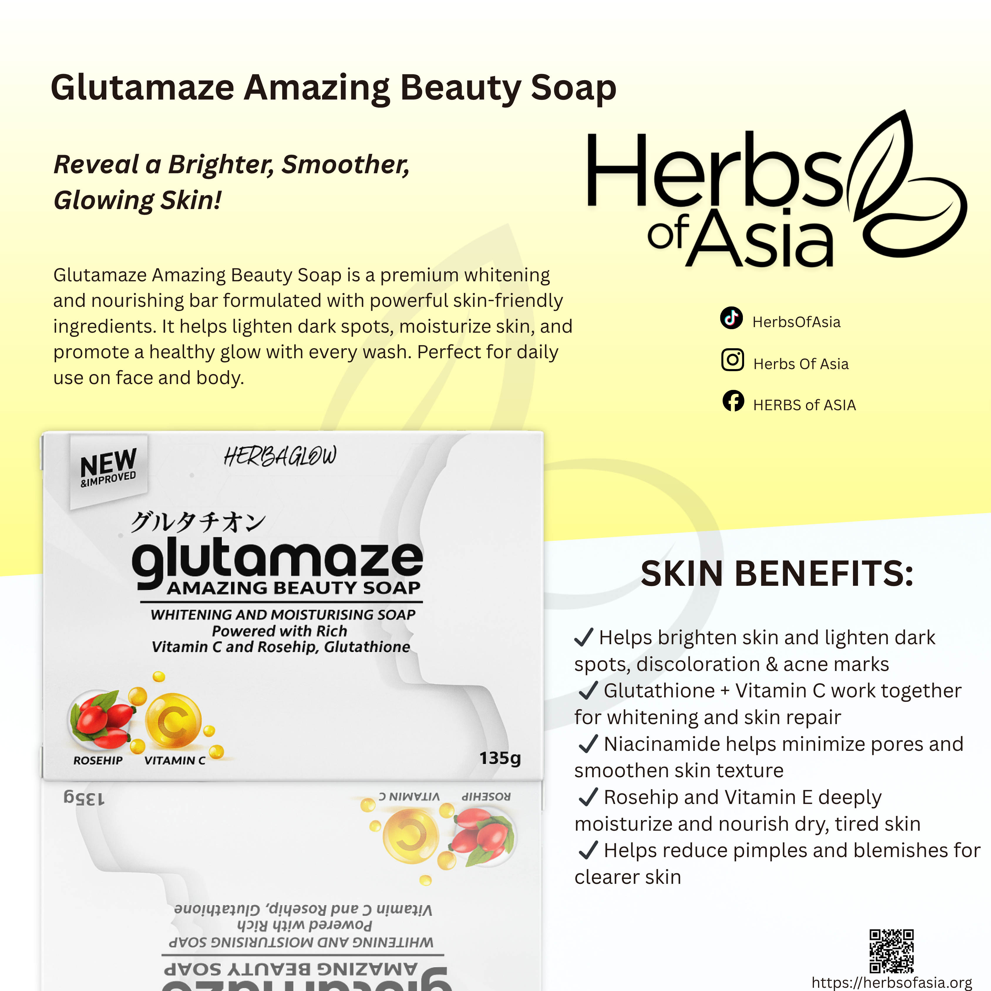 Experience the glow you deserve with Glutamaze Amazing Beauty Soap — your daily partner for radiant, soft, and youthful skin. Infused with Glutathione, Vitamin C, and Rosehip Extract, this advanced whitening and moisturizing soap helps reduce dark spots, even out skin tone, and deeply nourish your skin. Each wash leaves you with a visibly brighter, smoother, and more luminous complexion.