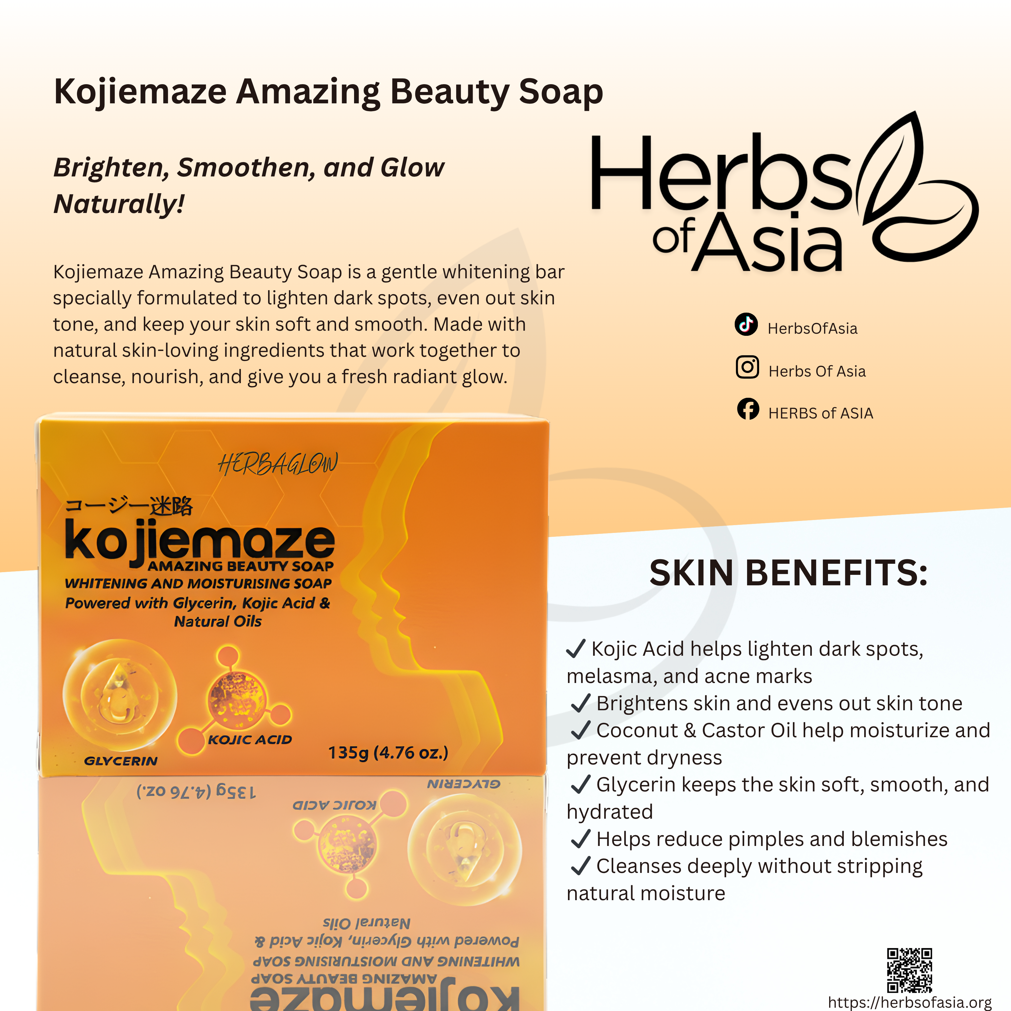 Reveal your skin’s natural brightness with Kojiemaze Amazing Beauty Soap — a rich blend of Kojic Acid, Glycerin, and Natural Oils that work together to whiten, smoothen, and deeply hydrate the skin. Formulated for daily use, it gently removes impurities and helps fade dark spots, giving you a clearer, softer, and more radiant complexion with every wash.